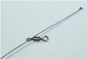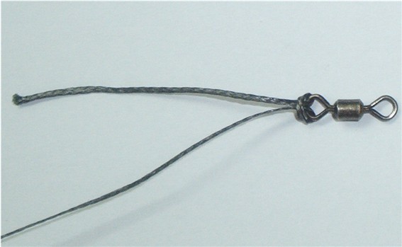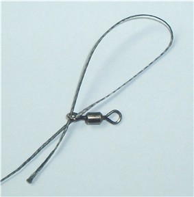 Anschließend steckt man ein Ende durch den Wirbel, macht einen Bogen und schiebt es wieder zurück. Im Stahlvorfach ist jetzt eine Schlaufe ohne Knoten, auf der der Wirbel sitzt. Der Wirbel wird dann in das Vorfach eingeschlauft, so als ob man zwei monofile Schnüre mittels Schlaufenknoten miteinander verbindet. Diesen “Knoten” festziehen.