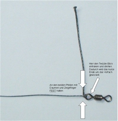 Jetzt nimmt man den Twizzle-Stick (oder eine Häkelnadel) und hängt die Öse des Wirbels ein. Jetzt mit der anderen Hand das Vorfach stramm halten und das kurze Ende im Winkel von 90° zum strammen Ende fest zwischen zwei Finger pressen. Dann dreht man mit dem Twizzle-Stick den Wirbel und damit das Vorfach. Dadurch wird das kurze ausgeglühte Ende fest um das Vorfach gewickelt. Fertig. Wer will, kann diese Wicklung auch noch mit Sekundenkleber sichern, muss man aber nicht.