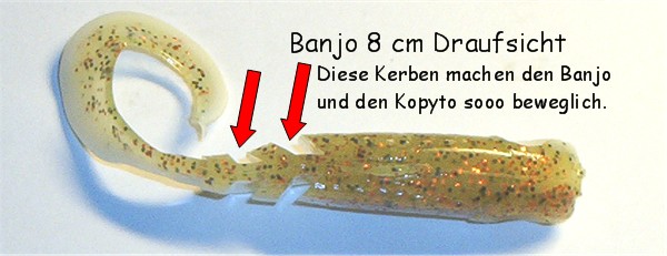 Der Banjo stellt trotz oder wegen seiner geringen Größe einen Ernst zu nehmenden Raubfischköder dar. Die beiden kleinen Modelle in 4,5 und 5,5 cm sind allererste Wahl, wenn es auf Forellen geht, was auch schon mancher Betreiber eines Put & Take Gewässers leidvoll feststellen musste. Aber auch und gerade im Frühsommer, wenn die Brut unterwegs ist, ist er durch (fast) nichts zu schlagen. Die Wurfeigenschaften sind natürlich in Abhängigkeit des kleinen Hakens und des kleinen Bleikopfes bescheiden (insbesondere beim 4,5er, der 5,5er geht schon), aber zum Fangen reicht es meistens doch. Wer wirklich weit werfen will, sollte es vielleicht mit einem Sbirulino versuchen. Im Mittellandkanal und im Stichkanal Salzgitter vor unserer Haustür sind diesem kleinen Gummifisch / Twister schon etliche hundert Barsche und auch Zander zum Opfer gefallen.